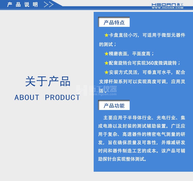 HGXP20卡盤直徑小巧,適用于微型元器件的測試,,精磨表面,平面度高。配套旋轉臺可實現(xiàn)360°微調(diào)旋轉。